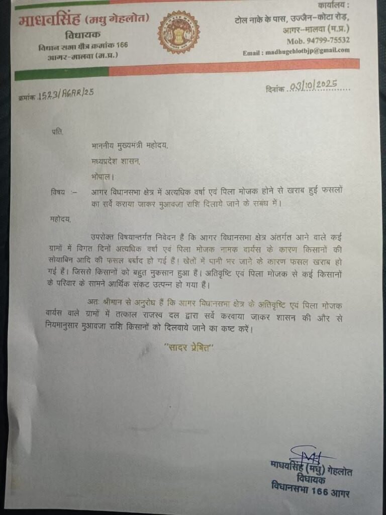 वहीं सत्ताधारी पार्टी से आगर विधायक माधव सिंह गहलोत ने भी प्रदेश के मुखिया डॉ मोहन यादव को पत्र लिखा है, जिसमे उल्लेखनीय है कि आगर मालवा जिले में भी अतिवृष्टि एवं पीला मोजेक वायरस से कई ग्रामों में किसानों की सोयाबीन की फसलें बुरी तरह बर्बाद हो गई हैं, जिसक राजस्व के अधिकारियों से तत्काल सर्वे करवा कर आगर जिले के किसान भाइयों को मुआवजा राशि वितरण की जाए।
